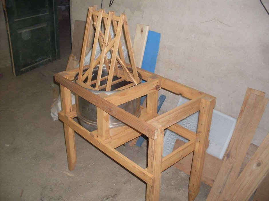 Вот и я подумал, что не такие у меня объёмы, что бы тратить деньги. Всё равно распечаткой занимаются всего два человека. Вот и сделал деревянный, с двумя рабочими местами. Даже два сделал. Один полностью деревянный, а другой с использованием бака от стиральной машины. Но подружке больше по душе пришёлся полностью деревянный. Обычная рама на ножках, Дерево + саморезы + клей. Два рабочих места друг против друга, снизу целофан с наклоном. На который падает забрус и капли мёда. Под сток с целофана ставится кастрюля.