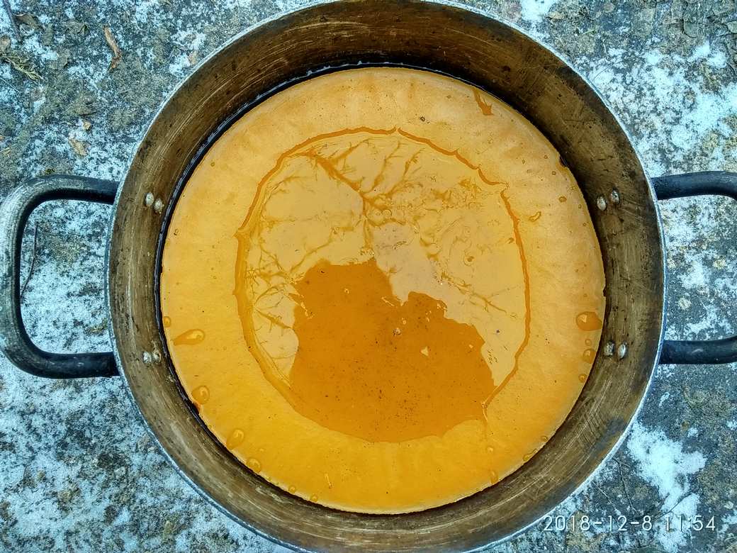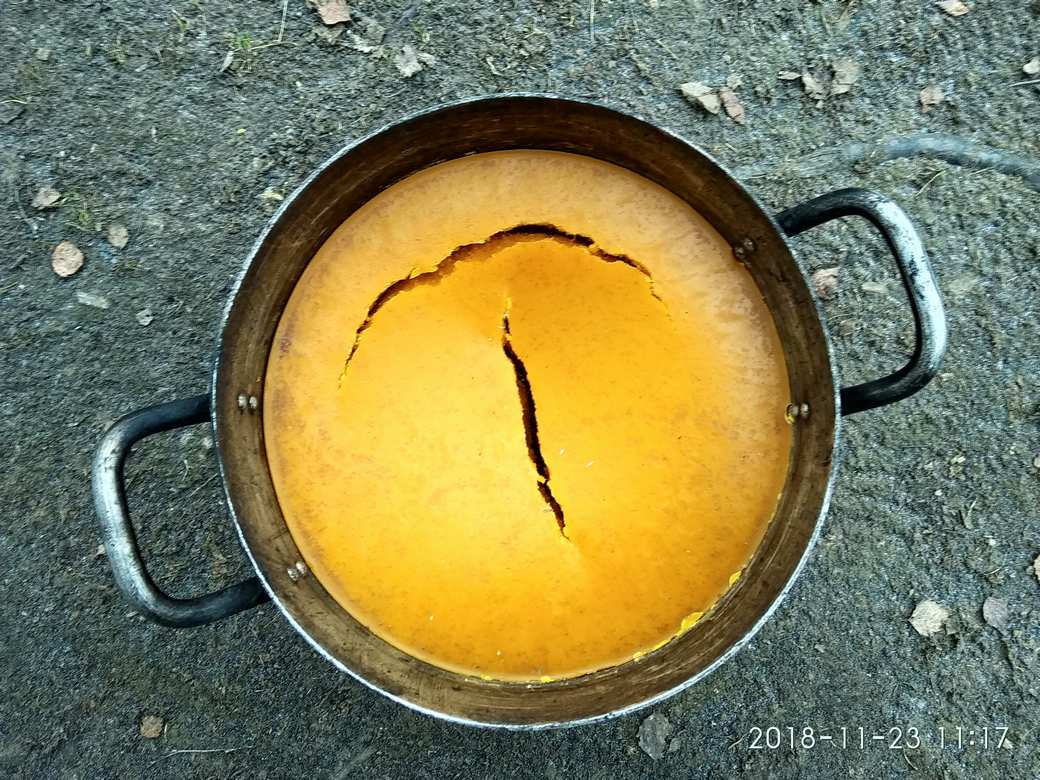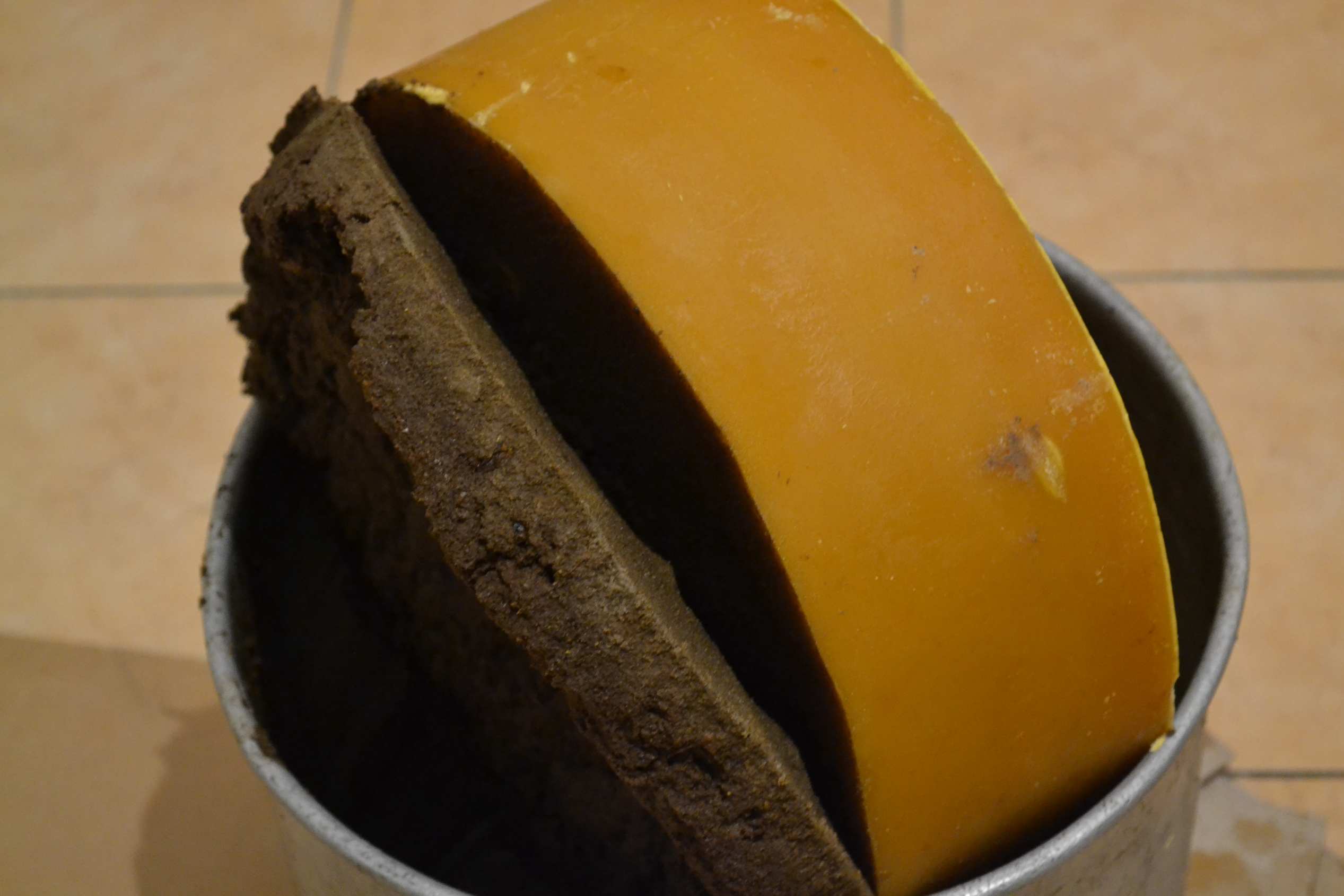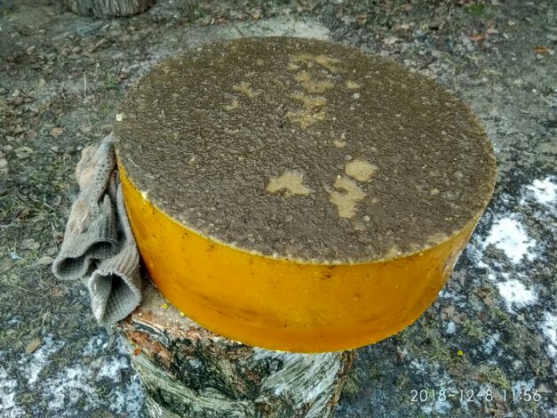 Вот воск отформованный после пресса. Трещины,прилип к стенкам,чтоб извлечь,пришлось греть стенки.Грязи было много.Почистил и перетопил.