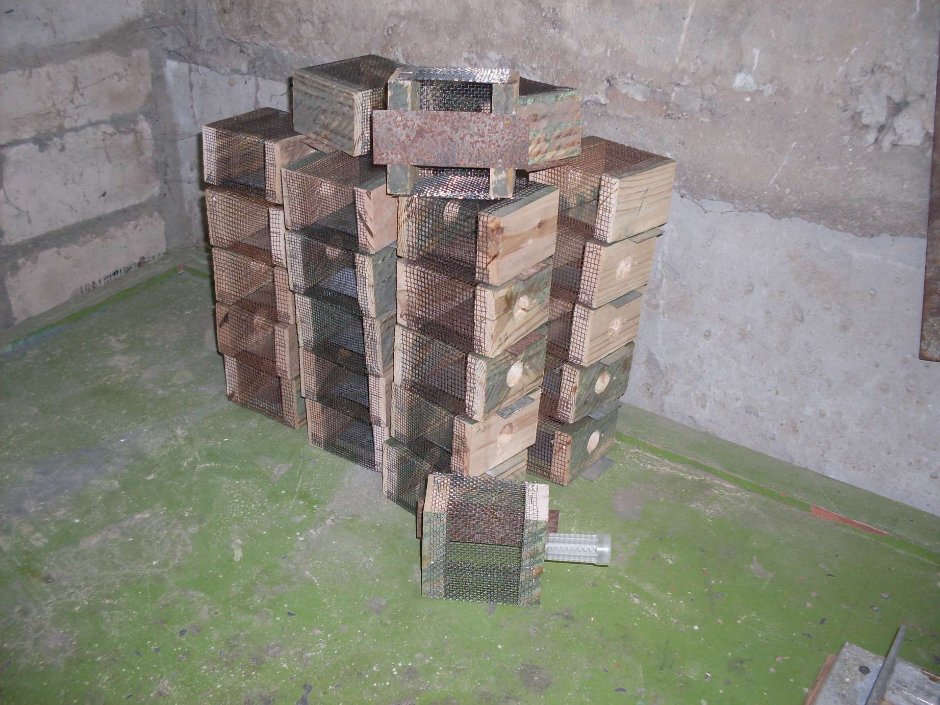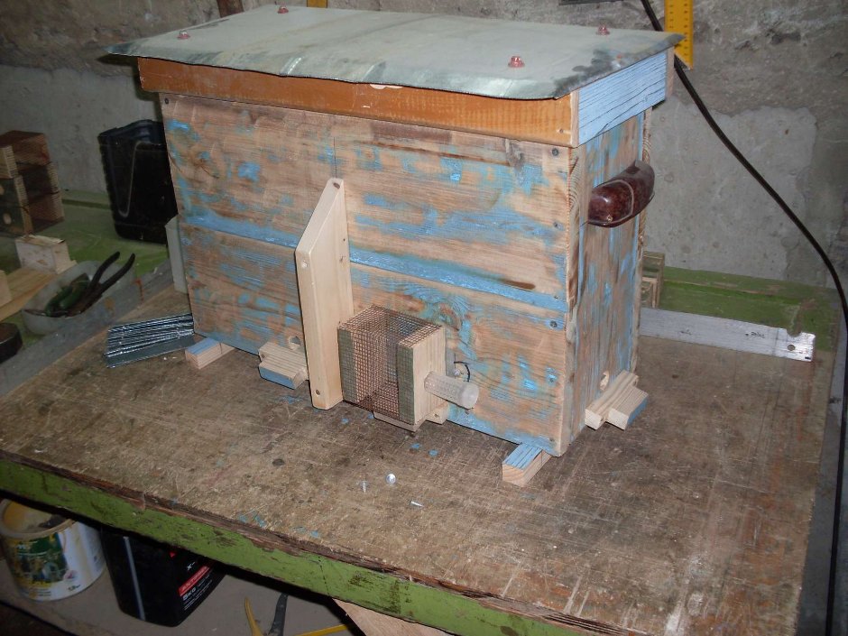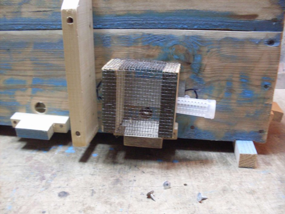 В видео не указанны конкретные размеры верандочки. Поэтому я делал исходя из имеющихся материалов и размеров моих мининуков. Устройство моей верандочки очень простое. Её внешние размеры - ширина 10 см, высота 9 см, а глубина 6 см. Внутренний объём 320 см.куб. Деревянные боковушки. В одной из стенок верандочки просверлено отверстие диаметром 22 мм. Оно закрывается пробкой, а при подсадке матки пробка вынимается и вставляется "бигуди" от китайского набора "никот". Низ, перед и верх верандочки из сетки. Вместо задней стенки прибита полоска жести размером 12 см на 4 см. При её помощи верандочка и крепится. В стенку нуклеуса ввинчены два самореза с широкими шляпками. Между ними расстояние 12+. Верандочка просто между ними вставляется и вынимается.