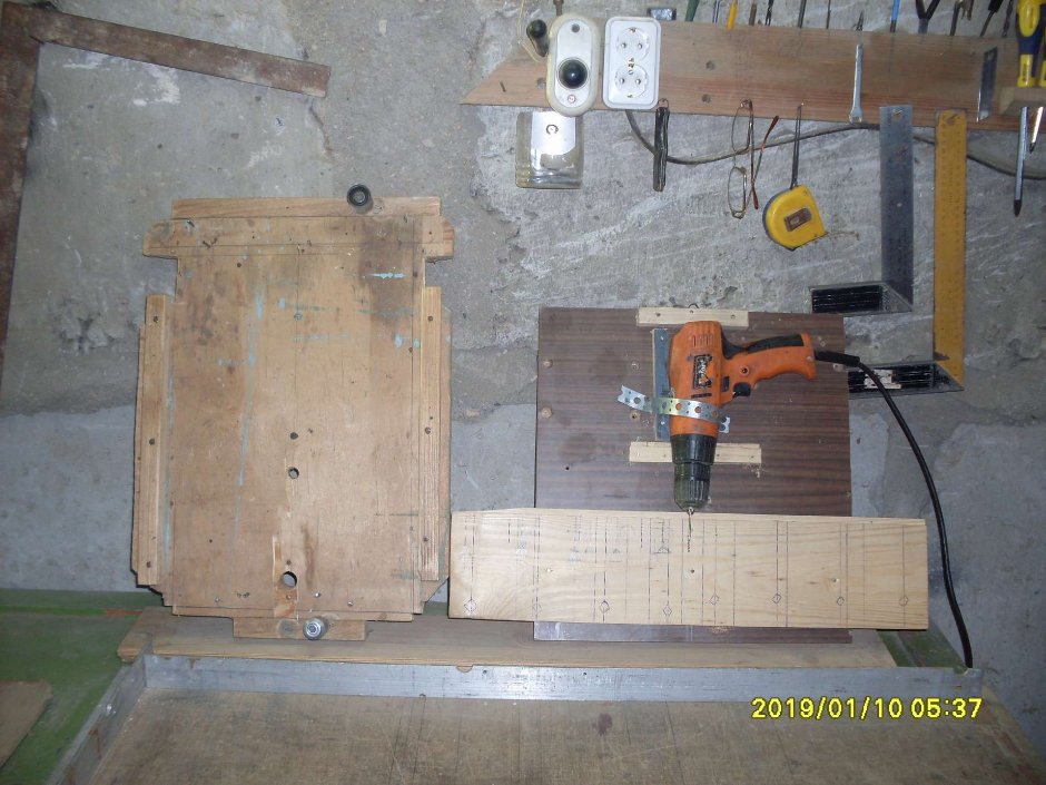 У меня так же простое устройство для натяжения проволоки. Привинчиваю саморезом к столу и работаю. Рамка в нём стоит зафиксированная между металлических штырей(на фото плохо видны) не искривляясь по диагонали. Проволоку натягиваю пассатижами. Но не очень туго. А рядом стоит простейшая приспособа для сверления под проволоку дырок в рейках. Из которых потом делаю рамки.