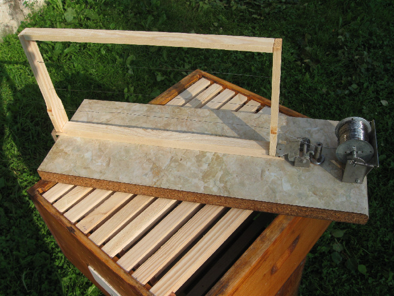 Я лично натягиваю проволоку сидя у телевизора. Рамку закрепляю горизонтально. Проволока 0.35 мм, термостатабилизированная нержавейка. Тонкая. Можно протягивать цыганской иголкой. Натягиваю вручную. Концы закручиваются. Лишнее отрезается ножницами. Рамка с такой проволокой выдерживаат, как минимум две смены вощины.
