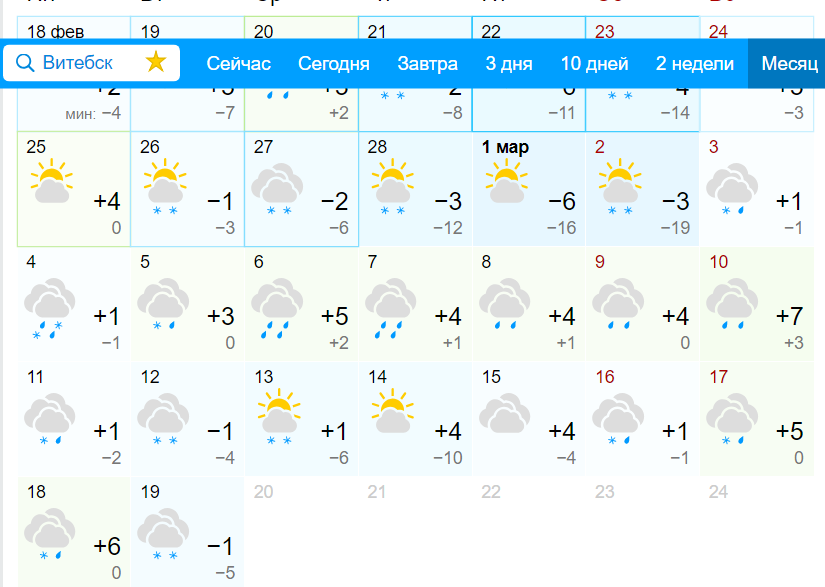 Такая же история и на моей Смоленщине,только я на самом севере её..Олег писал(а): 18 фев 2019, 21:46Мороз и солонце день чудесный закончился. Пчёлки сидели носа не показывая и сидеть им ещё как минимум месяц. Снег просел хорошо уже кротовины показываются, завтра вроде как + 3 обещают и потом опять морозики. Opera Снимок_2019-02-18_214300_www.gismeteo.ru.png